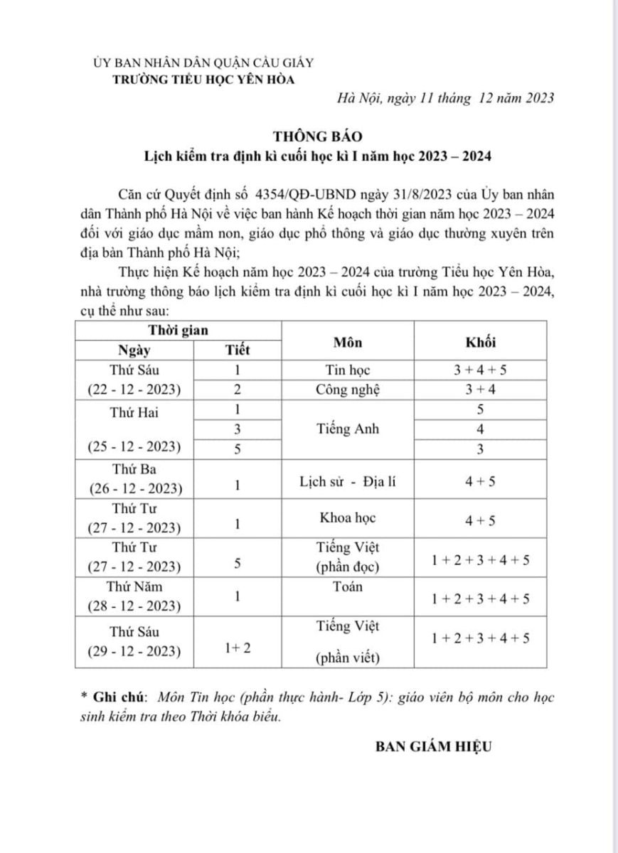 Trường Tiểu học Yên Hoà thông báo Lịch kiểm tra định kì cuối học kì I - Năm học 2023-2024