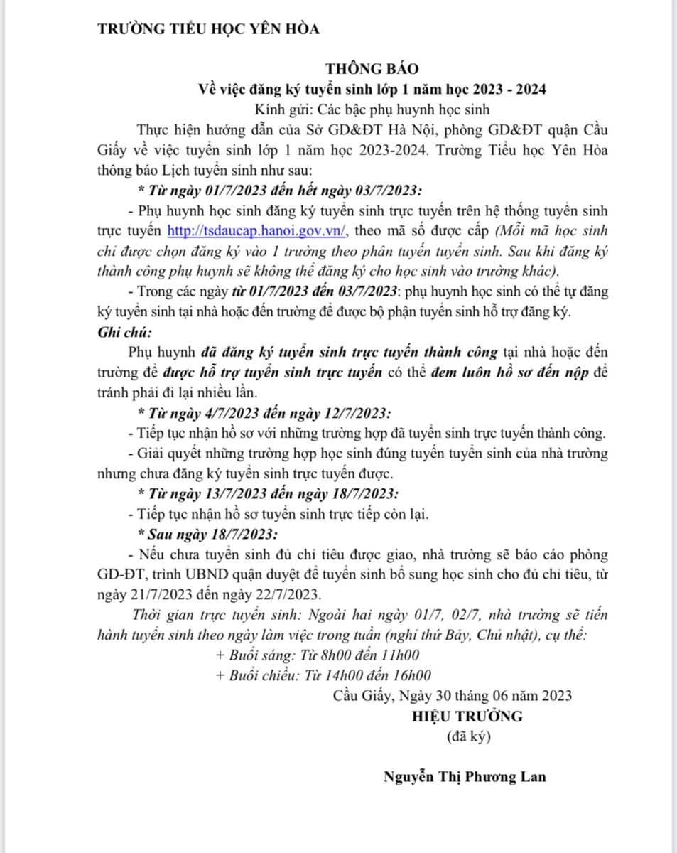 TRƯỜNG TIỂU HỌC YÊN HOÀ THÔNG BÁO VỀ VIỆC ĐĂNG KÍ TUYỂN SINH LỚP 1 - NĂM HỌC 2023-2024