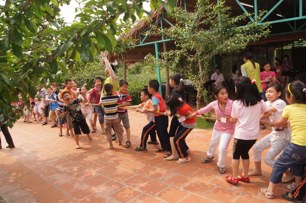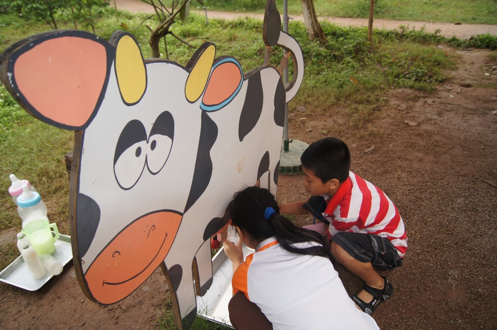 Các em học sinh tham gia trò chơi vắt sữa bò