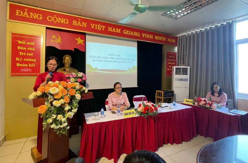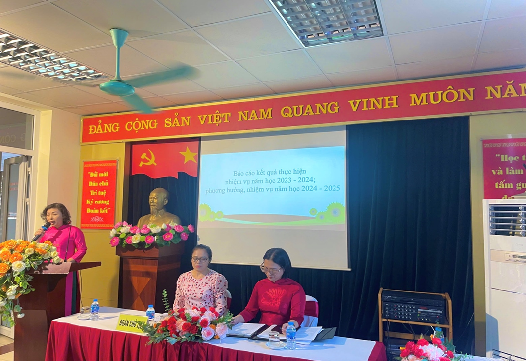 Sau khi đồng chí Nguyễn Thị Phương Hồng thông qua chương trình Hội nghị, đồng chí Đặng Thị Kim Khuê – Phó hiệu trưởng nhà trường báo cáo về việc thực hiện nhiệm vụ năm học 2023-2024 và phương hướng thực hiện các nhiệm vụ năm học 2024-2025.