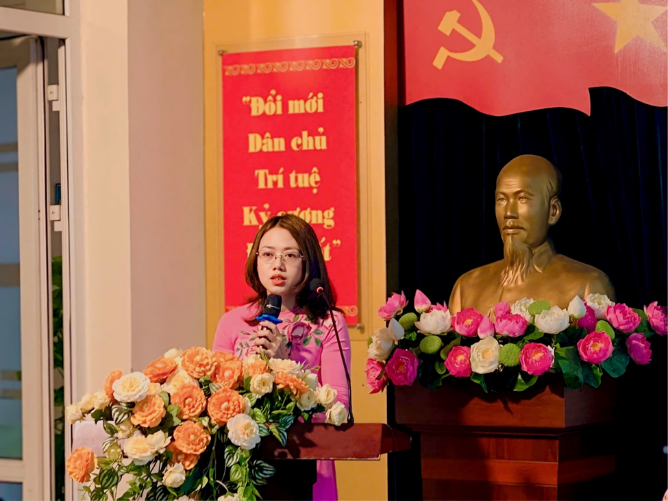 Đồng chí Đặng Thị Kim Khuê – Phó hiệu trưởng nhà trường báo cáo về việc thực hiện nhiệm vụ năm học 2023-2024 và phương hướng thực hiện các nhiệm vụ năm học 2024-2025.
