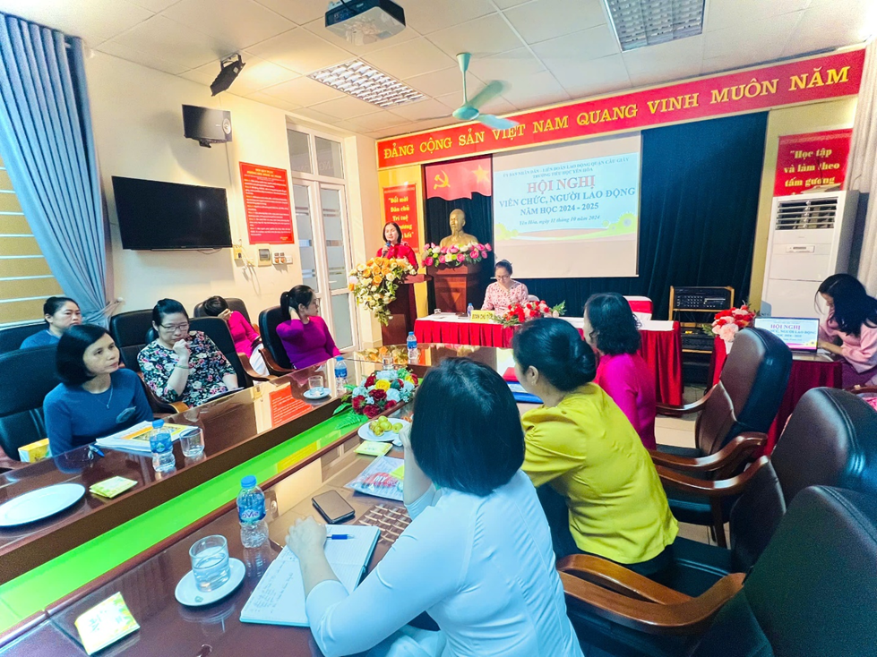 Nhà trường rất vinh dự được tiếp đón đồng chí Phạm Thị Lâm Anh – Phó Chủ tịch Liên đoàn Lao động quận Cầu Giấy đến dự Hội nghị. Tham dự Hội nghị có đầy đủ các đồng chí là cán bộ, giáo viên và nhân viên của nhà trường. Hội nghị đã được nghe báo cáo kết quả thực hiện Nghị quyết Hội nghị viên chức, người lao động của nhà trường năm học 2023 – 2024 cùng các phương hướng, chỉ tiêu, giải pháp thực hiện nhiệm vụ năm học 2024 – 2025.