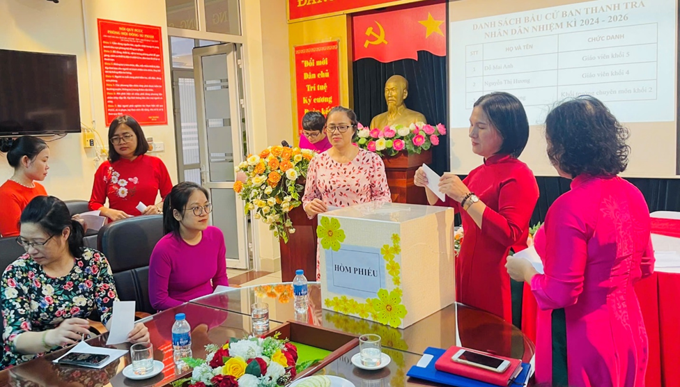 Sau khoảng thời gian làm việc nghiêm túc và khẩn trương, Hội nghị đã đi đến biểu quyết thông qua các chỉ tiêu cơ bản của nhiệm vụ năm học 2024-2025; thống nhất các kế hoạch, chỉ tiêu đề ra, hứa quyết tâm thực hiện bằng biểu quyết 100% ý kiến nhất trí và bầu được Ban thanh tra nhân dân nhiệm kì 2024 – 2026.
