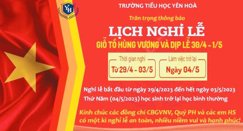 Trường Tiểu học Yên Hoà trân trọng thông báo Lịch nghỉ lễ Giỗ Tổ Hùng Vương và 30/4 - 1/5.