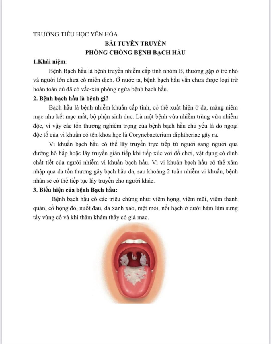 TRƯỜNG TIỂU HỌC YÊN HOÀ TUYÊN TRUYỀN PHÒNG CHỐNG BỆNH BẠCH HẦU