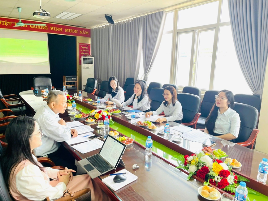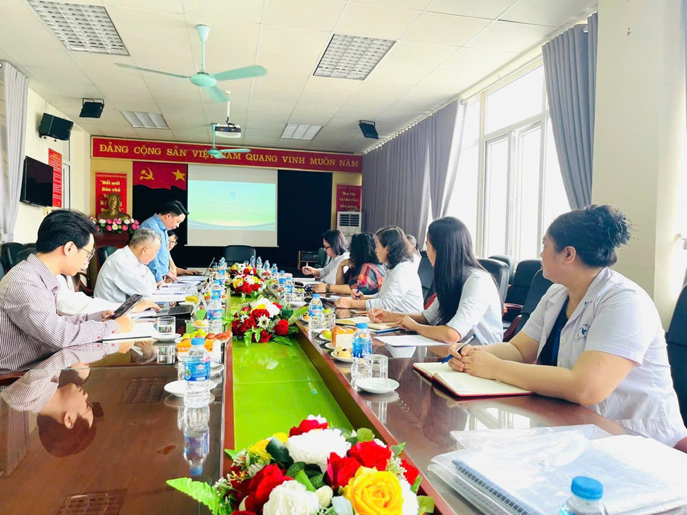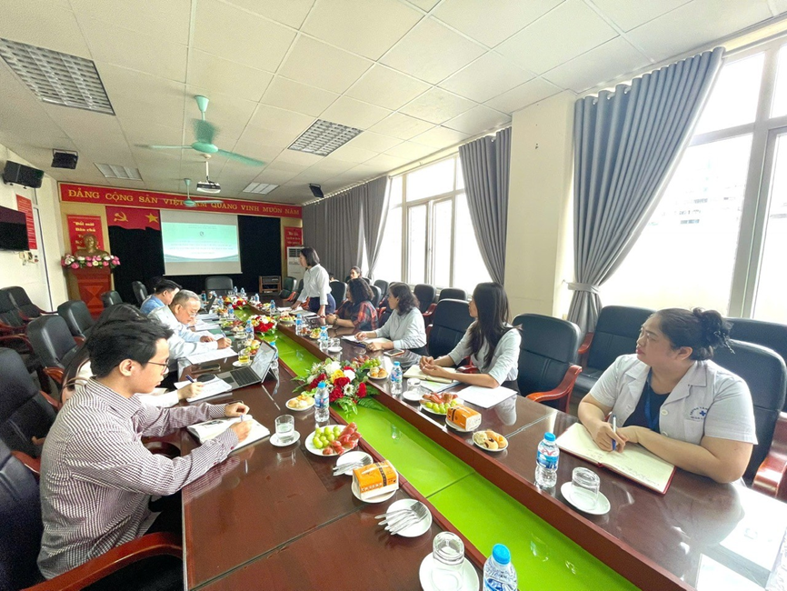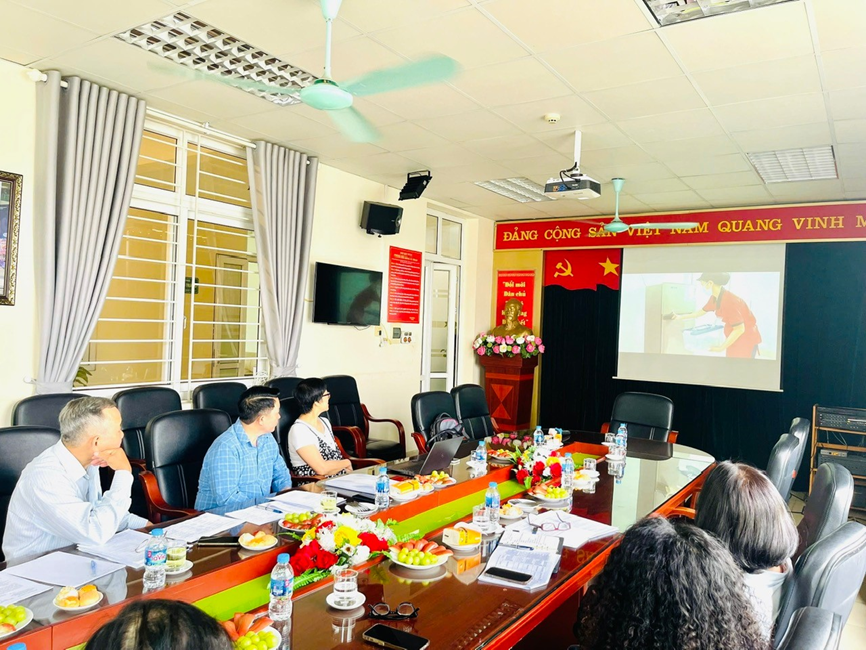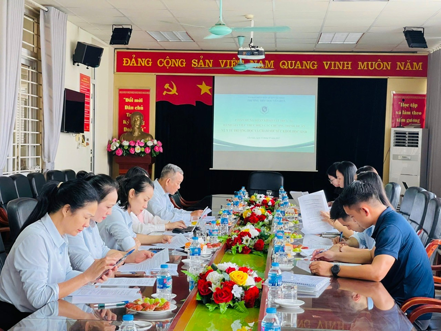 Sau khi giới thiệu và thông qua lịch làm việc, Đoàn khảo sát đã lắng nghe nhà trường báo cáo về việc triển khai thực hiện các chương trình, đề án của Thủ tướng Chính phủ về y tế trường học và chăm sóc sức khỏe trẻ em, học sinh giai đoạn 2019 – 2025. Tiếp đó, các chuyên gia đã tiến hành phỏng vấn sâu đối với Giám hiệu và cán bộ y tế học đường về việc triển khai các nội dung như: khám sức khỏe định kỳ, dinh dưỡng học đường, phòng chống dịch bệnh, truyền thông nâng cao nhận thức sức khỏe cho học sinh,… và điều hành Thảo luận nhóm với đại diện giáo viên trong trường về những thuận lợi, khó khăn, đề xuất kiến nghị thực tế trong quá trình triển khai các chương trình, đề án. Buổi làm việc đã diễn ra trong không khí khẩn trương, nghiêm túc với tinh thần chia sẻ cởi mở, ghi nhận nhiều ý kiến thiết thực và những sáng kiến sáng tạo của đội ngũ cán bộ, giáo viên, nhân viên tham gia phỏng vấn và thảo luận.
