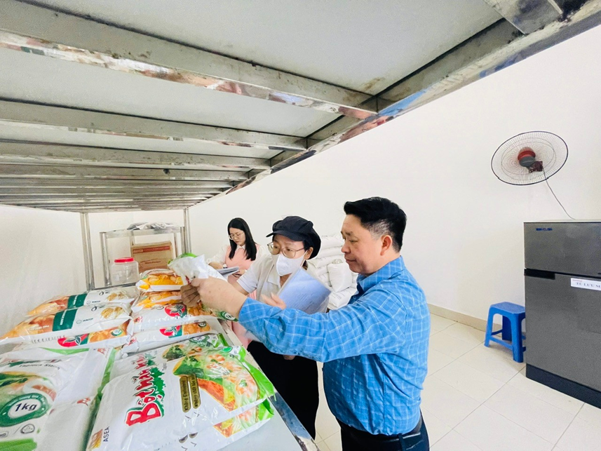 Đoàn tiến hành kiểm tra bếp ăn, các dụng cụ, thiết bị phục vụ công tác bán trú trong nhà trường.