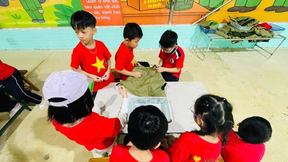 Buổi chiều, không khí tiếp tục sôi nổi tại khu hậu cần quân đội và phong trào thi đua yêu nước. Các em được hóa thân thành lực lượng giao liên, thanh niên xung phong; khám phá mô hình “Quân y cục”; trải nghiệm nấu ăn bằng bếp Hoàng Cầm, gấp chăn nội vụ, buộc dây giày,… Qua đó, học sinh hiểu hơn về công việc thầm lặng nhưng vô cùng quan trọng của các lực lượng hậu cần, quân y và quân nhu trong chiến trường xưa.