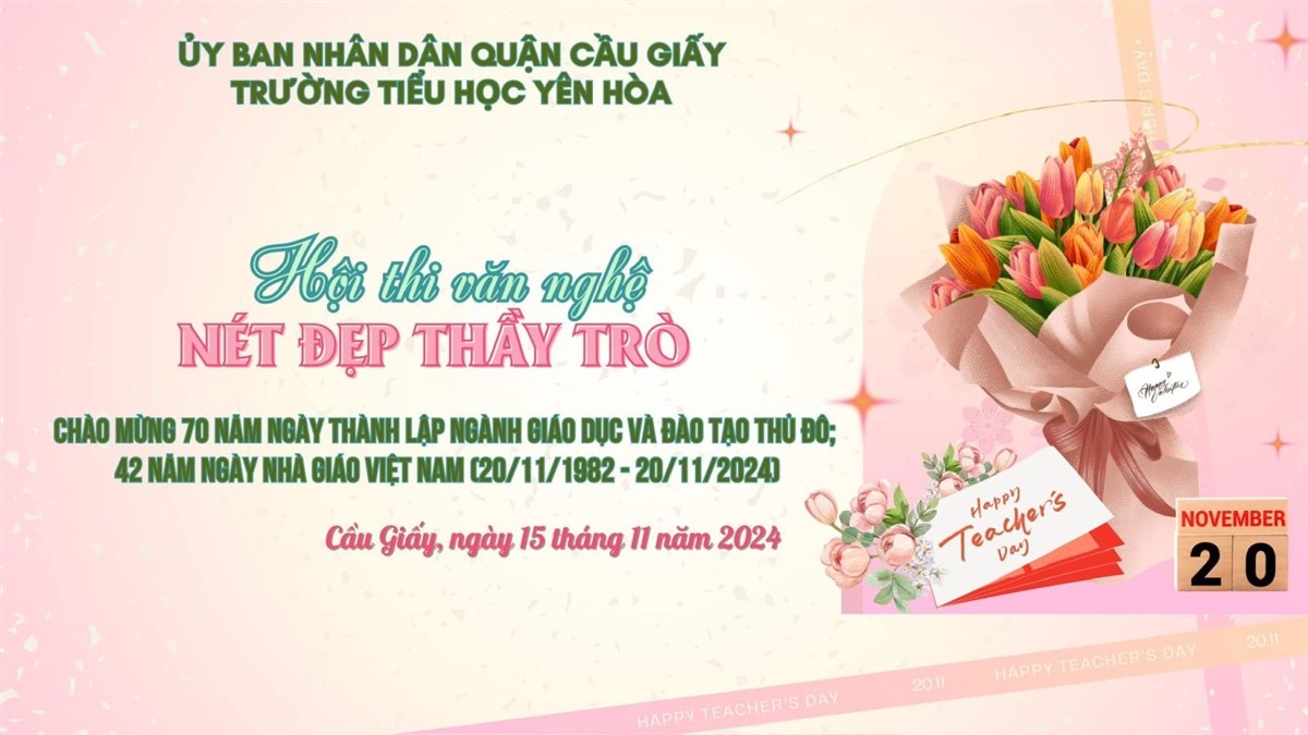 Hòa chung không khí tưng bừng chào mừng kỷ niệm 70 năm ngành Giáo dục & Đào tạo Thủ đô và 42 năm ngày Nhà giáo Việt Nam 20-11, sáng ngày 15/11/2024, trường Tiểu học Yên Hòa tưng bừng tổ chức Hội thi văn nghệ “Nét đẹp thầy trò”. Hội thi là một trong những hoạt động trọng tâm của năm học, nhằm tạo sân chơi lành mạnh, bổ ích và không khí vui tươi, phấn khởi hướng tới ngày cả nước dành tình cảm tri ân tới các thầy cô giáo.
