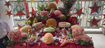 Trong mâm cỗ có sự hiện diện của chị Hằng được khắc tinh tế, thướt tha qua bàn tay khéo léo của các mẹ, các cô. Hình ảnh nhẹ nhàng, thướt tha này cũng làm chúng ta liên tưởng đến hình các cô giáo trong tà áo dài, nhẹ nhành chỉ bảo, dạy dỗ các con nên người => Đây là sự tri ân đến các thầy cô, những người lái đó thầm lặng đưa các con đến bến bờ tri thức.