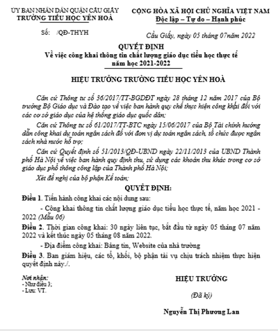 Về việc công khai thông tin chất lượng giáo dục tiểu học thực tế, năm học 2021 - 2022; công khai cam kết chất lượng, thông tin cơ sở vật chất, thông tin về đội ngũ nhà giáo, cán bộ quản lý và nhân viên công khai tài chính của trường Tiểu học Yên Hoà năm học 2022- 2023