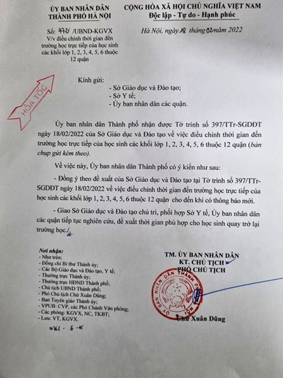 Kính gửi Quý phụ huynh và các em học sinh! Thực hiện nội dung văn bản số 472/UBND-KGVX của UBND TP. Hà Nội về việc điều chỉnh thời gian đến trường học trực tiếp của học sinh lớp 1 - 6 thuộc 12 quận (được đăng tải dưới đây), trường Tiểu học Yên Hòa tiếp tục thực hiện dạy và học trực tuyến từ ngày 21/02/2022 cho đến khi có thông báo mới. Trân trọng ./.